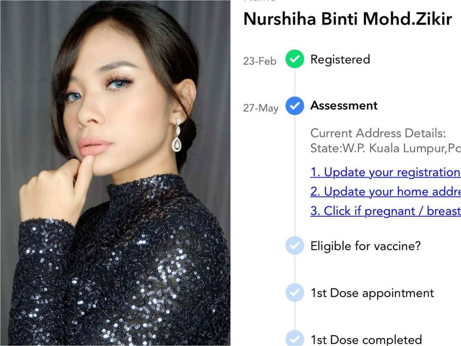 Terdahulu Shiha berkongsi hantaran tangkap layar temu janji di aplikasi MySejahtera yang memaparkan informasi di mana ibunya akan menerima vaksin di Pusat Pemberian Vaksin (PPV) di Pusat Dagangan dan Pameran Antarabangsa Malaysia (MITEC).