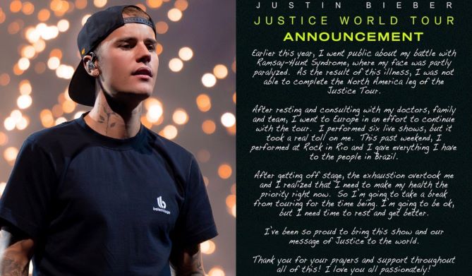 “Awal tahun ini, saya membuat kenyataan secara terbuka mengenai sindrom Ramsay-Hunt yang sedang saya alami. Ia membuatkan separuh wajah saya lumpuh dan kerana masalah kesihatan ini, saya tidak dapat menyelesaikan konsert jelajah Justice Tour di Amerika Utara.