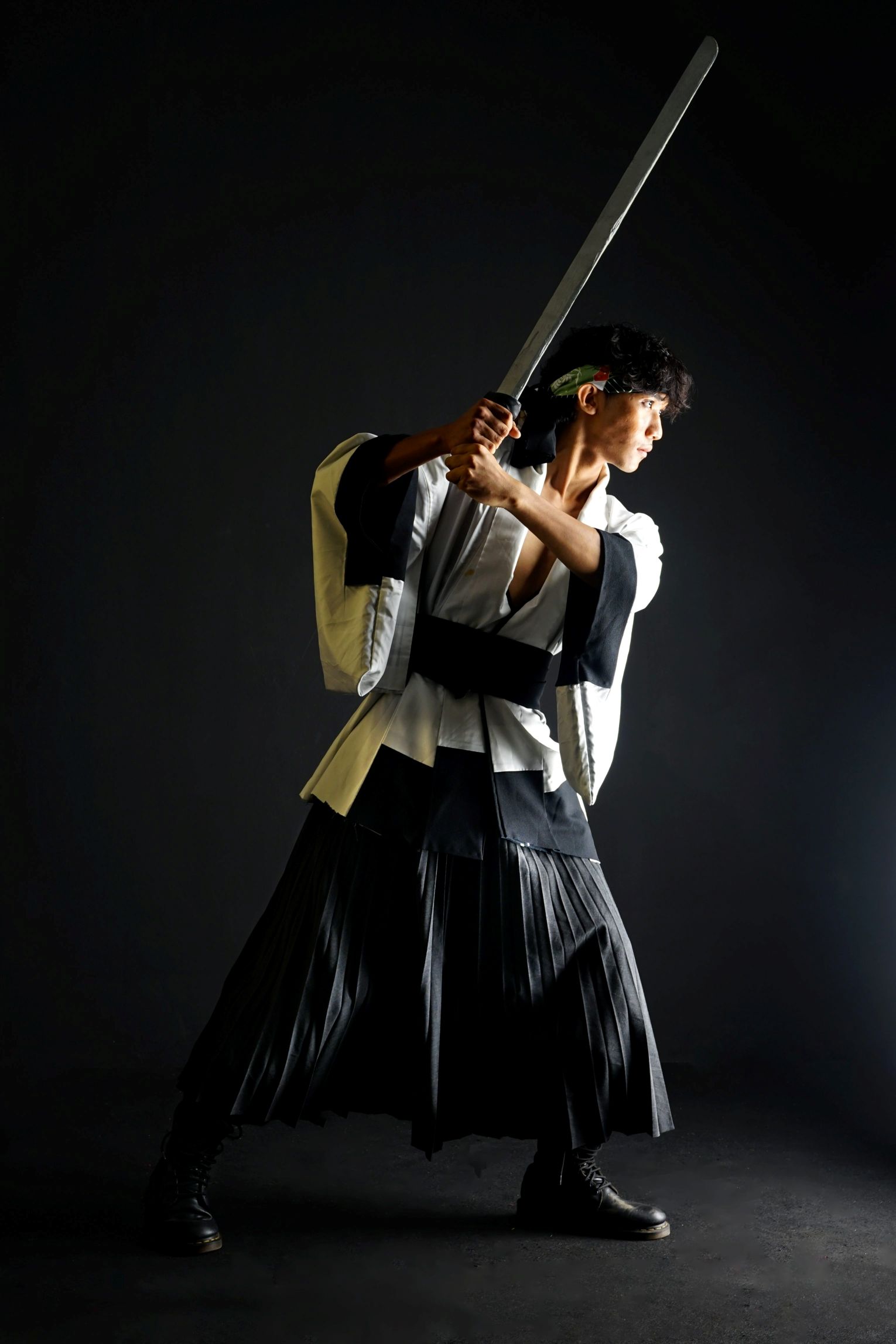 Cahaya berarah ditumpukan tepat pada struktur wajah, genggaman tangan dan bilah pedang.