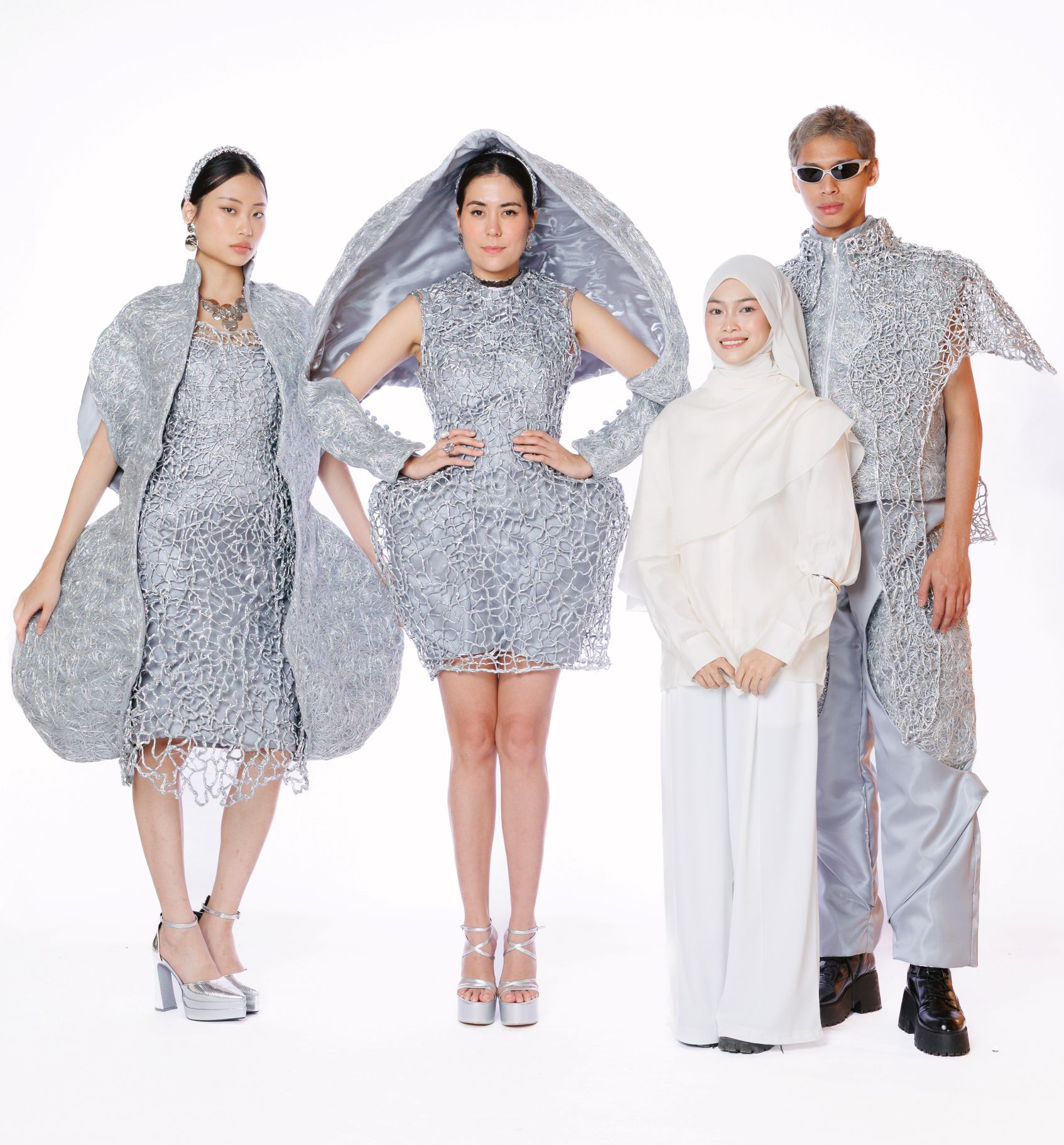Keunikan koleksi pereka muda ini terletak pada teknik pembentukan tekstur yang menggunakan gam panas dan benang perak metalik.