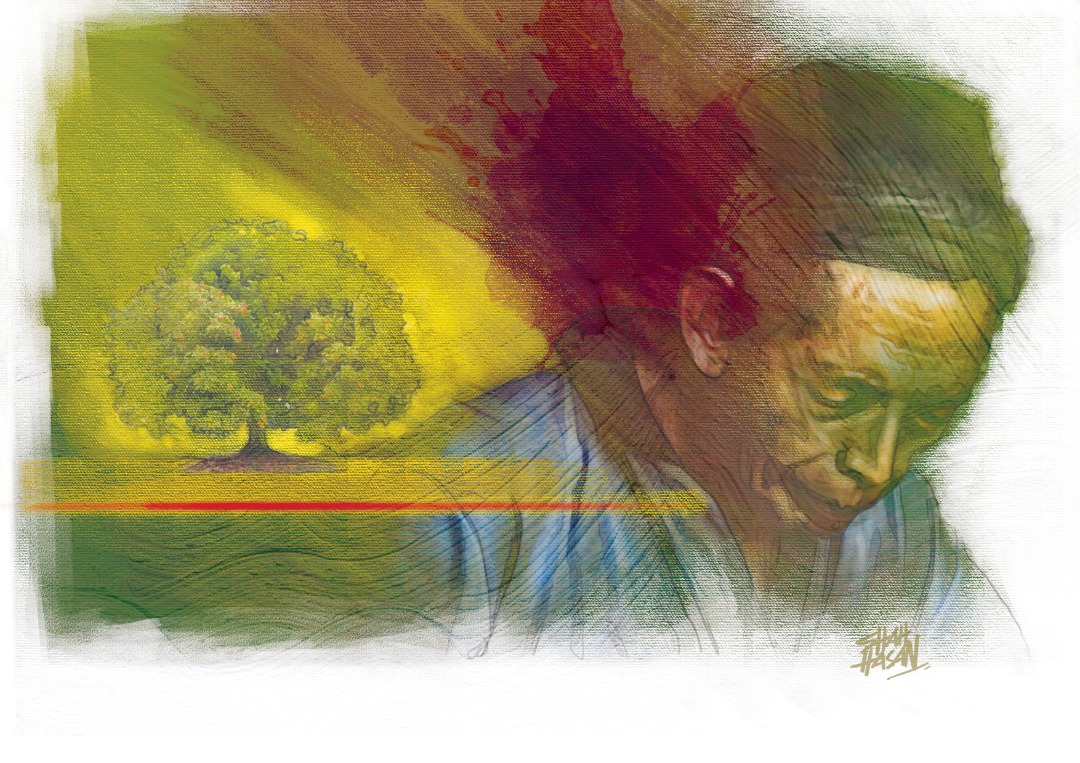 Perlahan-lahan dia menuju ke pangkin. Dia tepis beberapa helai daun kering dengan tangan kanan. Tangan kirinya memegang tongkat, menahan kaki kiri yang tidak berdaya berdiri dengan sendiri. Dia labuhkan punggung di tengah-tengah pangkin kayu. Dia menghela nafas. Panjang. Sekali lagi dia pandang ke kanan. Che Embong dan Anak Sekolah telah bertukar merah kehitaman. Malah ada yang gugur.