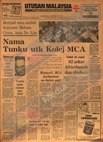 PADA 12 Ogos 1968, Utusan Malaysia melaporkan Timbalan Yang Dipertua MCA yang juga Menteri Perdagangan dan Perusahaan, Tan Sri Dr. Lim Swee Aun mengisytiharkan kolej anjuran MCA dinamakan Kolej Tunku Abdul Rahman.