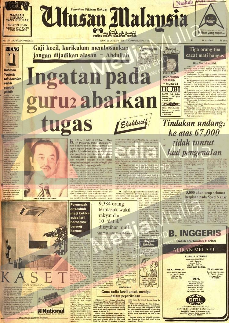 Pada 28 Januari 1985, akhbar Utusan Malaysia melaporkan Menteri Pelajaran, Tun Abdullah Ahmad Badawi mengingatkan guru-guru supaya jangan menjadikan soal gaji kecil, kurikulum yang membosankan atau penglibatan dalam kegiatan sosial, ekonomi dan politik di luar sekolah sebagai alasan untuk mengabaikan tugas sebagai pendidik yang bertanggungjawab.