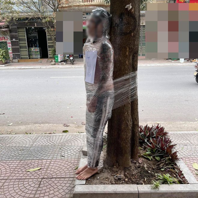 HANOI: Akibat gagal menjelaskan bayaran wang untuk tatu, seorang lelaki dihukum dengan dibalut plastik dan diikat pada sebuah pokok di Hanoi.