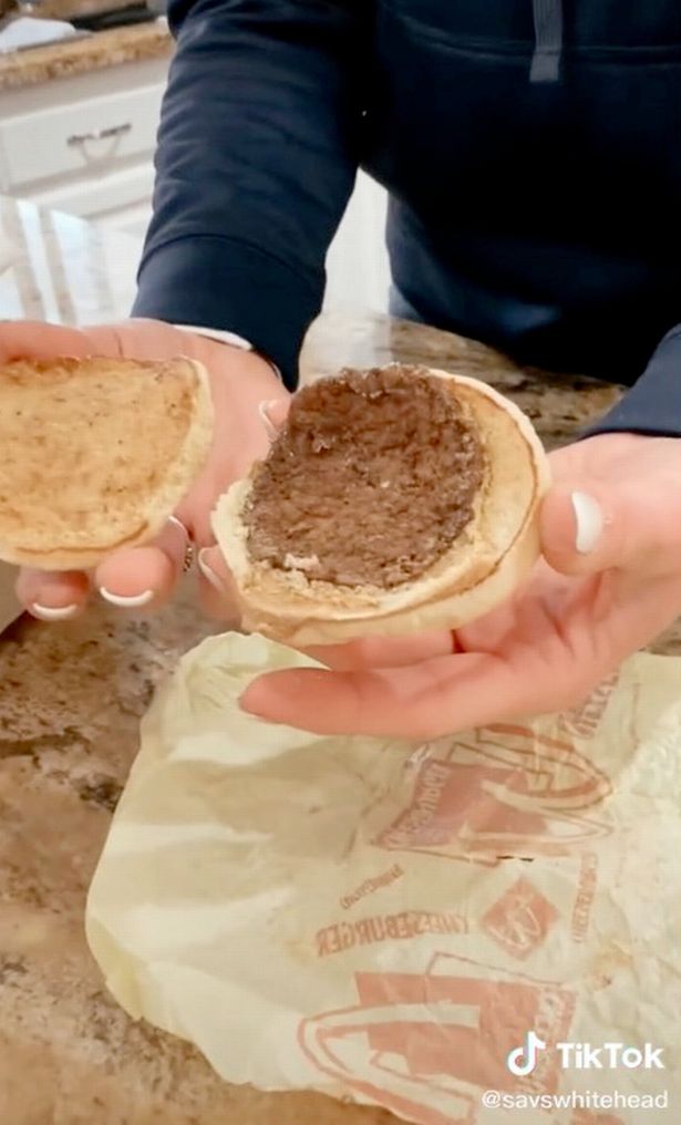 Selepas dia membuka bungkusan burger itu, roti itu kelihatan agak keras untuk dibuka dan mendapati isi daging di dalamnya masih dalam keadaan baik.