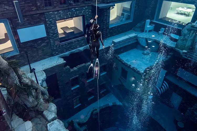 Kolam sedalam 60 meter itu bernama Deep Dive Dubai yang terletak di Nad El Sheba I, Dubai, Emiriah Arab Bersatu.