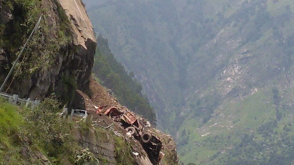 Lapor BBC, bongkah batu yang jatuh secara mendadak menghempap sebuah bas, trak serta kenderaan lain sepanjang jalan raya di Himachal Pradesh.