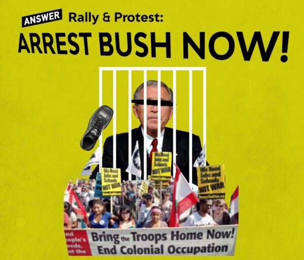 Terdahulu di luar auditorium, beberapa aktivis berhimpun sambil memegang sepanduk menuntut Bush ditahan dan menyifatkan pemimpin itu sebagai ‘penjenayah perang’.