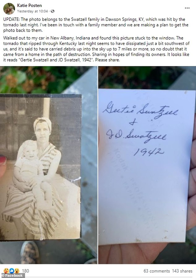 Menurut Posten, dia percaya gambar lama berkenaan merupakan antara serpihan yang diterbangkan oleh tornado ketika bencana alam itu melanda Kentucky.