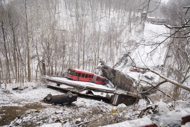 Pihak berkuasa Pittsburgh memaklumkan, tiga orang dimasukkan ke hospital akibat kecederaan selepas jambatan itu runtuh dalam gaung yang diselaputi salji tebal.