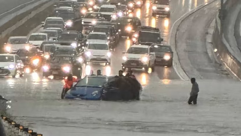 Jalan-jalan utama juga terhalang akibat banjir, menyebabkan kesesakan lalu lintas yang panjang di lebuh raya.