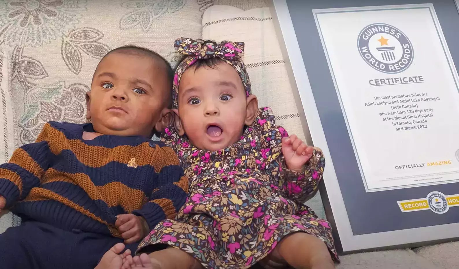 Adiah dan Adrial Nadarajah mencipta Rekod Dunia Guinness sebagai bayi kembar paling pramatang yang masih hidup selepas berumur setahun pada 4 Mac lalu.