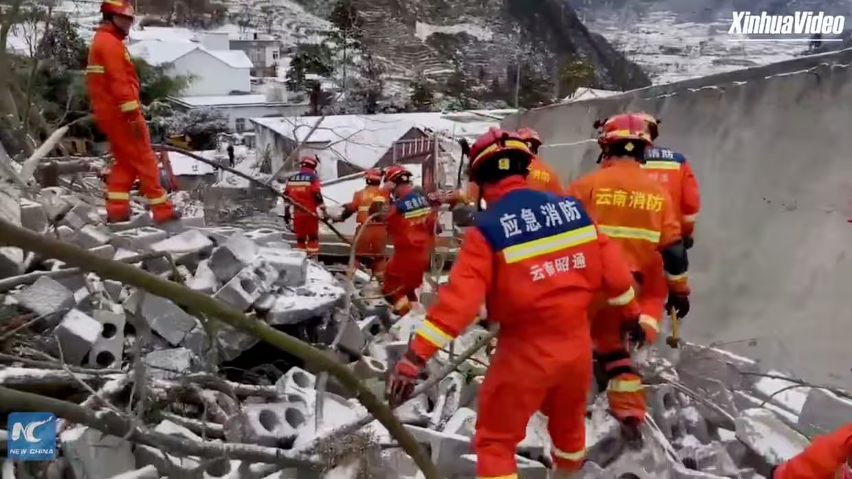 Rakaman dikongsi di media sosial menunjukkan anggota penyelamat mengalihkan timbunan batu yang runtuh di tengah-tengah pergunungan yang dilitupi salji.