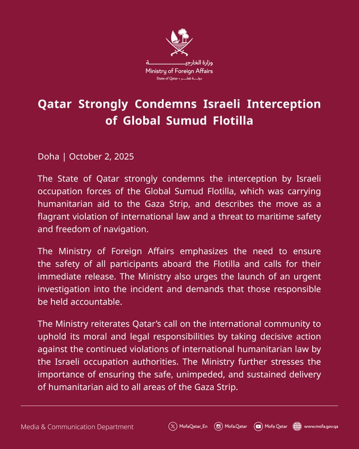 DOHA: Kementerian Luar Qatar mengecam tindakan Israel memintas kapal-kapal Global Sumud Flotilla dan menyifatkan rampasan besar-besaran itu sebagai ancaman kepada keselamatan maritim dan kebebasan pelayaran. Dalam satu kenyataan, kementerian itu menyeru pembebasan segera mereka yang ditahan dan menuntut pihak yang bertanggungjawab dibawa ke muka pengadilan. “Kementerian mengulangi seruan Qatar kepada masyarakat antarabangsa supaya menunaikan tanggungjawab moral dan undang-undang mereka dengan mengambil tindakan tegas terhadap pelanggaran berterusan undang-undang antarabangsa oleh pihak…