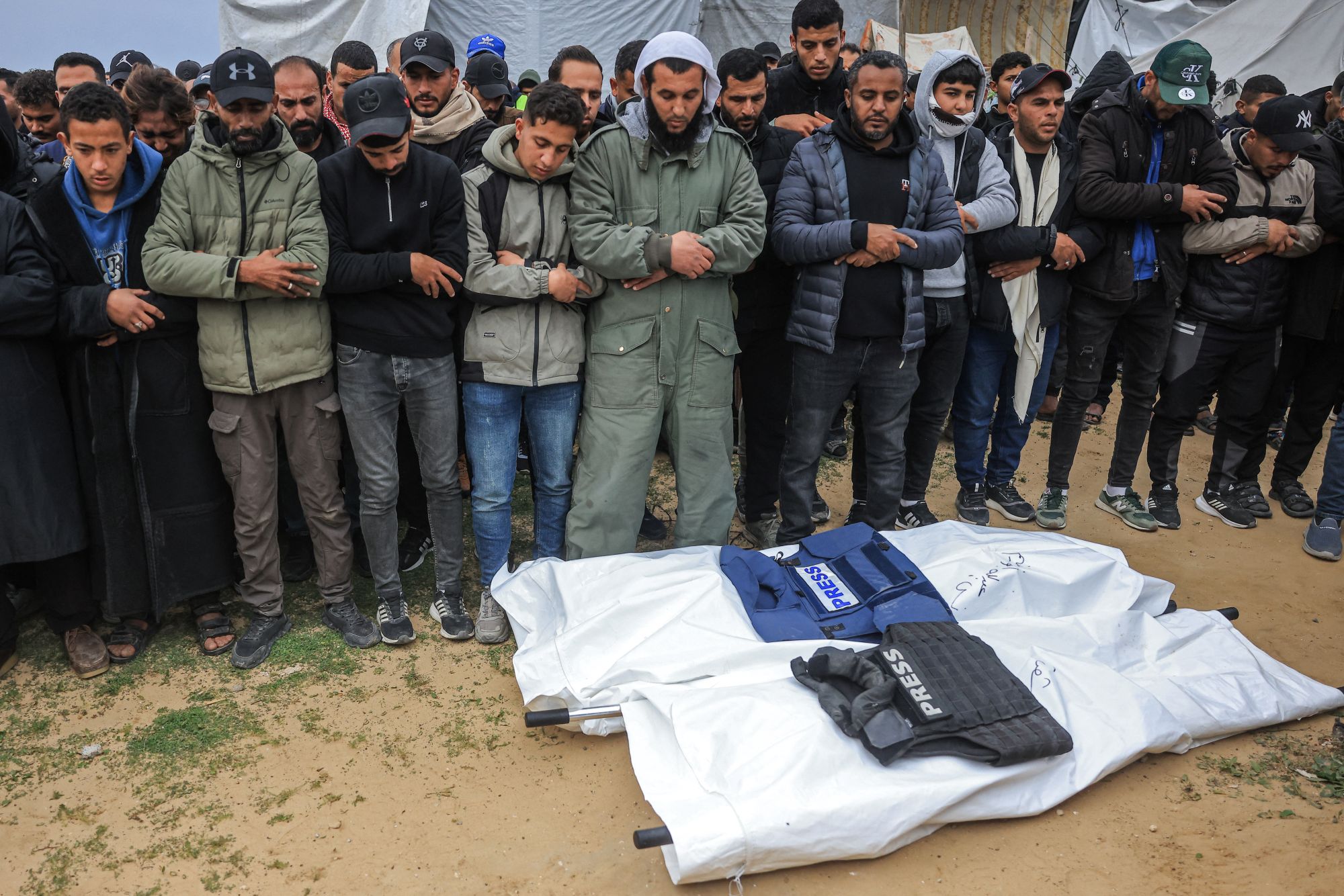 Di atas salah satu pengusung, sehelai jaket kalis peluru dengan tulisan Press dan dua kuntum bunga diletakkan di atas jenazah Abdul Raouf Shaath, penyumbang tetap AFP.