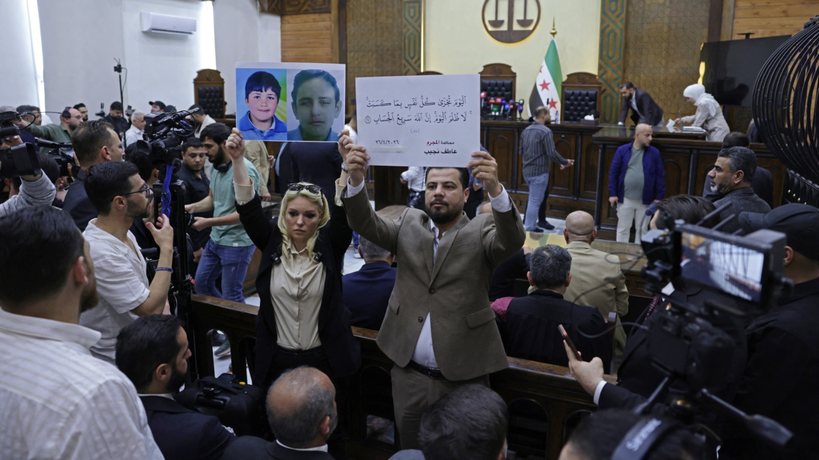 Di dalam bilik mahkamah, bapa dan ibu mangsa menyifatkan detik itu sebagai sesuatu yang bersejarah. Turut kelihatan sebuah panel yang memaparkan wajah Hamza al-Khatib, kanak-kanak berusia 13 tahun yang menjadi simbol penentangan awal rakyat selepas dia ditahan dan diseksa dengan kejam.