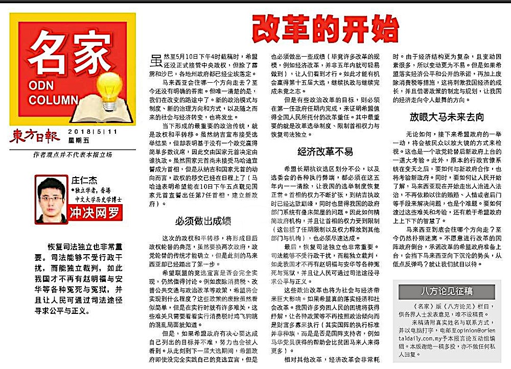 Sejauh mana kerajaan mampu baiki negara? AKHBAR Oriental Daily bertarikh 11 Mei 2018 memaparkan tulisan Chuang Jen Kiat melalui ruangan Kolum ODN yang mempersoalkan kemampuan kerajaan Pakatan Harapan perbaiki negara. Memulihkan perundangan negara amat penting kerana mahkamah sepatutnya dibiar membuat keputusan secara bebas, memberikan keadilan dan kebenaran kepada rakyat. Artikel ini disiapkan pada pukul 4 petang 10 Mei 2018 ketika Pakatan Harapan masih belum menjadi kerajaan secara rasmi. Persoalannya, ke…