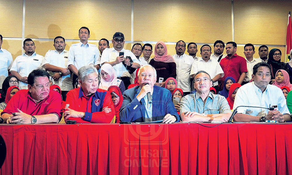 KUALA LUMPUR 12 Mei – Datuk Seri Najib Tun Razak hari ini membuat keputusan meletakkan jawatan sebagai Presiden UMNO dan Pengerusi Barisan Nasional (BN) serta-merta berikutan kekalahan teruk parti itu dalam Pilihan Raya Umum Ke-14 (PRU-14) lalu. Keputusan Najib melepaskan jawatan disandang beliau sejak 2009 itu dimaklumkan dalam satu sidang akhbar yang turut dihadiri oleh barisan kepemimpinan tertinggi UMNO termasuk daripada sayap Wanita, Pemuda dan Puteri. Suasana sebak dan pilu…