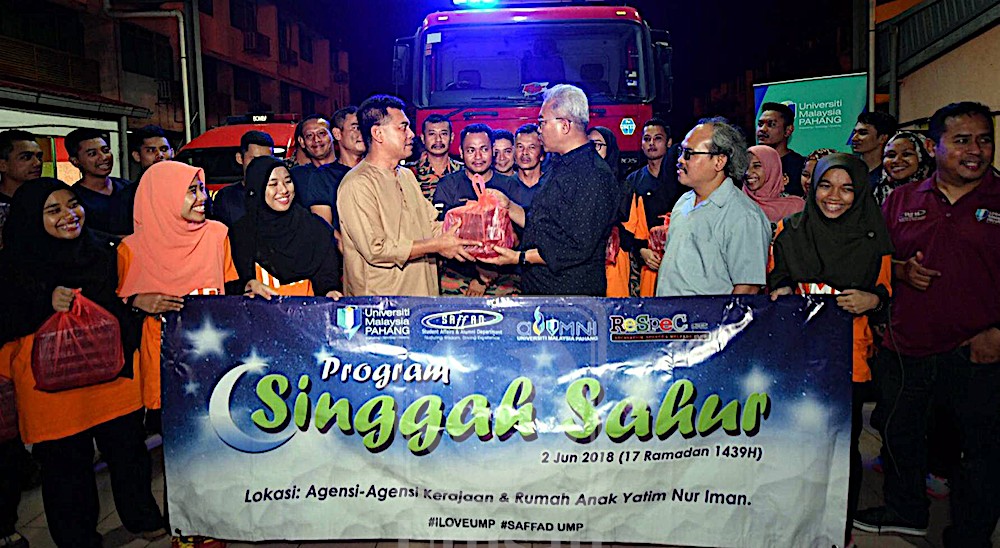 KUANTAN 5 Jun – Universiti Malaysia Pahang (UMP) menyantuni masyarakat di sekitar daerah ini sempena bulan Ramadan menerusi pelaksanaan Program Singgah Sahur baru-baru ini. Program memasuki tahun kelima penganjurannya itu bertujuan mengagihkan juadah bersahur kepada masyarakat terutama anggota keselamatan, agensi kerajaan dan penghuni rumah anak yatim. Timbalan Naib Canselor (Hal Ehwal Pelajar dan Alumni) UMP, Prof. Datuk Dr. Yuserrie Zainuddin berkata, program tersebut memberi tumpuan kepada petugas yang bekerja pada…