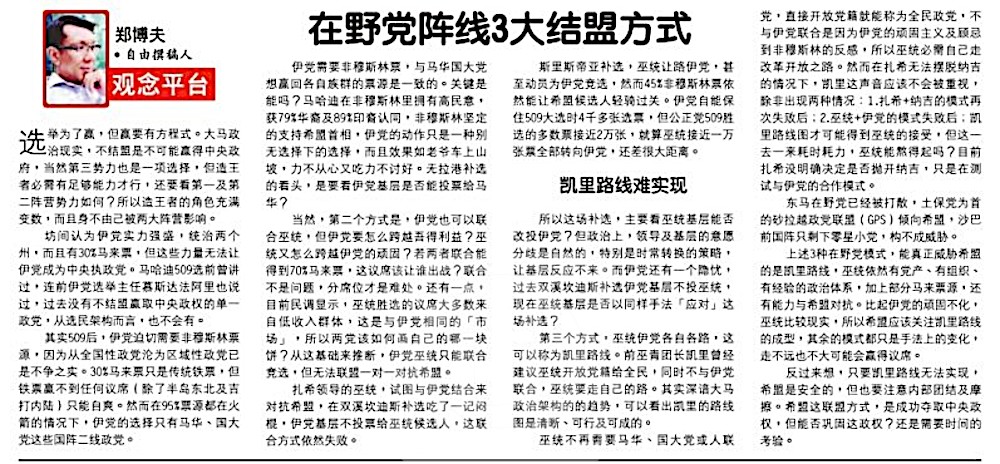 AKHBAR Oriental Daily News bertarikh 24 Ogos 2018 memaparkan tulisan Tay Poh Fuh yang mengupas mengenai formula dan strategi parti politik bagi mencapai kemenangan dalam pilihan raya. Dalam tulisannya yang bertajuk Pembangkang ada tiga cara model untuk bergabung dalam ruangan Kolum ODN di halaman 52, Poh Fuh menyatakan tentang situasi politik di Malaysia adalah bersandarkan kepada realiti. Parti-parti politik perlu bergabung bagi mendapatkan kuasa pemerintahan negara. Berhubung kedudukan Pas yang…
