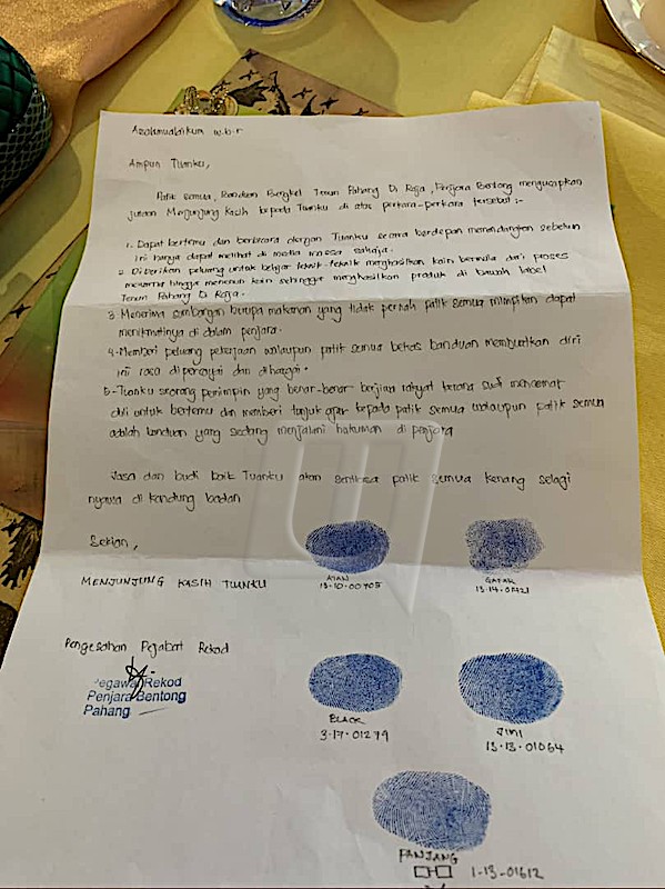 KUANTAN 6 Okt. – Sepucuk surat yang diutuskan oleh lima banduan di Penjara Bentong, dekat sini bersama kain keruping bagi menzahirkan penghargaan kepada Tunku Azizah Aminah Maimunah Iskandariah membuatkan Tengku Puan Pahang itu sebak dan menitiskan air mata. Lima banduan berkenaan mengikuti Bengkel Tenun Pahang Diraja di Penjara Bentong dan dikenali sebagai Atan, Gafar, Black, Jimi serta Panjang turut menurunkan cap jari mereka dalam surat itu. Kandungan surat itu dimuat…