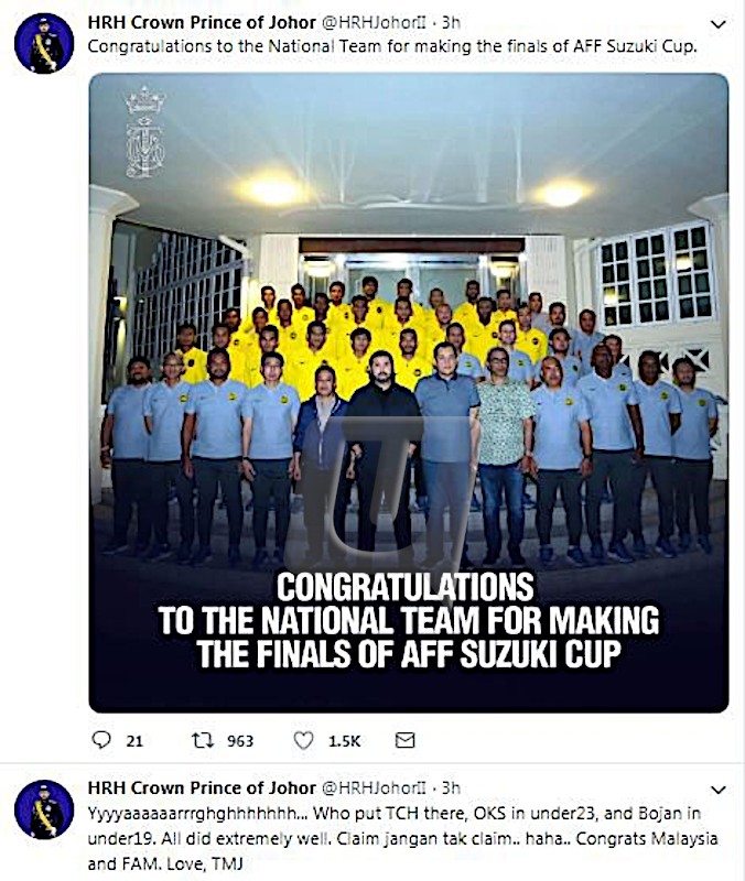 KUALA LUMPUR 6 Nov. – Gurauan bekas Presiden Persatuan Bola Sepak Malaysia (FAM), Tunku Ismail Sultan Ismail sejurus selepas Malaysia melangkah ke final Piala AFF mencuri tumpuan peminat. STATUS yang dimuat naik Tunku Ismail dalam Twitternya hari ini. Beberapa minit selepas Harimau Malaya menyingkirkan Thailand pada separuh akhir, Tunku Mahkota Johor (TMJ) memuat naik status di Twitter: “Yyyyaaaaaarrrghghhhhhhh…Who put TCH (Tan Cheng Hoe) there, OKS (Datuk Ong Kim Swee) in…