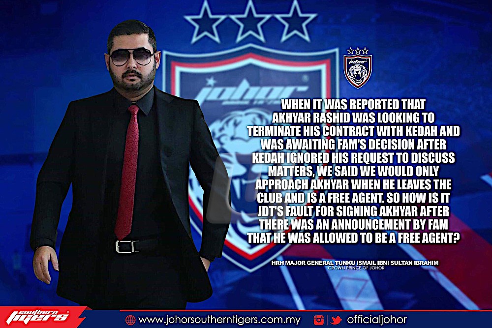 KUALA LUMPUR 1 Jan. – Tunku Ismail Sultan Ibrahim menegaskan, beliau tidak gentar dengan keputusan Persatuan Bola Sepak (KFA) mahu mengheret kes perpindahan Akhyar Rashid ke Mahkamah Timbang Tara Sukan (CAS) atau Persekutuan Bola Sepak Antarabangsa (FIFA). Tegas pemilik Johor Darul Ta’zim (JDT) itu, Harimau Selatan bertindak mengikut undang-undang dan Kedah sepatutnya menyalahkan diri sendiri apabila Akhyar memilih untuk meninggalkan Lang Merah. Katanya lagi, jika bukan JDT sekali pun, mana-mana…