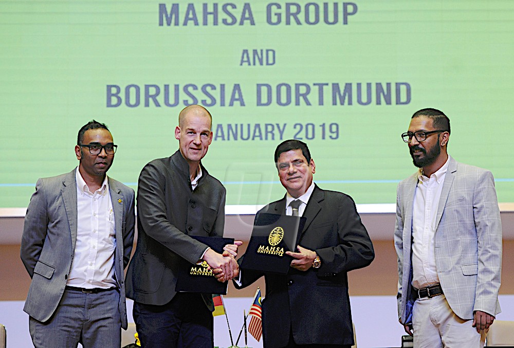 KUALA LUMPUR 31 Jan. – Universiti Mahsa menandatangani memorandum persefahaman (MoU) dengan kelab gergasi Jerman, Borussia Dortmund dalam usaha memberi pendedahan karier bola sepak profesional kepada pelajar sekali gus melahirkan lebih ramai pemain bertaraf dunia untuk negara. Pengerusi Eksekutif Kumpulan Mahsa, Prof. Tan Sri Dr. Mohamed Haniffa Abdullah berkata, kerjasama selama setahun itu membolehkan pelajar Universiti Mahsa mendapat pelbagai manfaat daripada kelab bola sepak tersebut. “Paling menarik adalah pelajar Universiti…