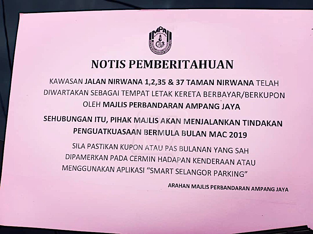 SAUDARA PENGARANG,SAYA mewakili Persatuan Pengguna Islam Malaysia (PPIM) ingin mengucapkan syabas dan tahniah atas segala usaha Majlis Perbandaran Ampang Jaya (MPAJ) selaku pihak berkuasa tempatan (PBT) dalam pengurusan demi kebaikan dan ketenteraman kawasan Ampang Jaya. Merujuk kepada pewartaan dan penguatkuasaan Jalan 1, 2, 35 dan 37 Jalan Nirwana, Ampang sebagai tempat letak kereta berbayar bermula Mac ini, pada hemat kami, ia menimbulkan keresahan kerana kebanyakan pengguna kawasan tersebut adalah penduduk…