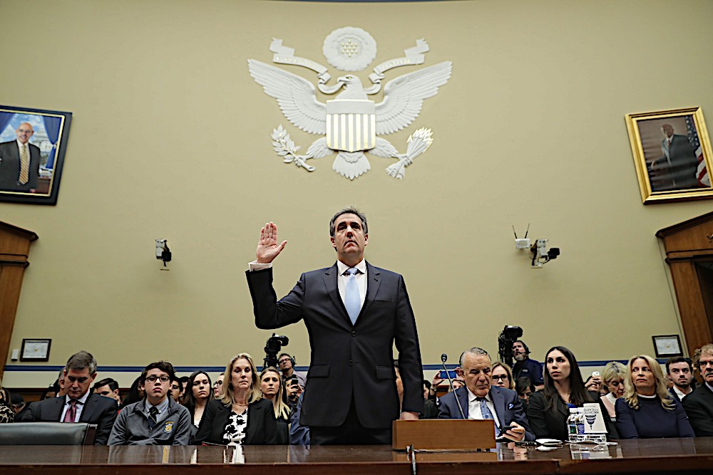 ANGKAT SUMPAH… Bekas Peguam Negara dan tukang atur, Michael Cohen mengangkat sumpah sebelum memberi kenyataan di hadapan Dewan Jawatankuasa Pengawasan di Capitol Hill hari ini. Pada tahun lalu, Cohen dijatuhkan hukuman penjara selama tiga tahun dan didenda AS$50,000 kerana lari daripada cukai, membuat keterangan palsu kepada institusi kewangan, sumbangan tidak sah kempen berlebihan dan menipu Kongres sebagai sebahagian daripada penyiasatan ejen khas, Robert Mueller. -AFP