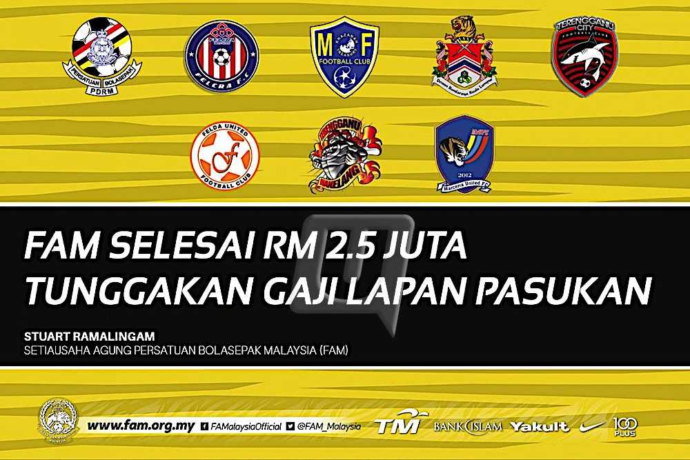 KUALA LUMPUR 7 Mac- Persatuan Bolasepak Malaysia (FAM) telah menyelesaikan tunggakan gaji pemain dan pegawai bagi lima pasukan Liga Malaysia (Liga M) yang berjumlah RM1,178,600 menggunakan wang deposit dan lain-lain wang yang dipegang badan induk bola sepak negara itu, hari ini. Lima pasukan tersebut adalah, Polis DiRaja Malaysia (PDRM), Felcra FC, MOF FC, DBKL FC dan Terengganu City FC. Setiausaha Agung FAM, Stuart Ramalingam berkata, FAM telah membayar tunggakan gaji…