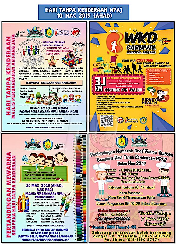 KUALA LUMPUR 6 Mac – Orang ramai dipelawa memeriahkan Karnival WKD (World Kidney Day) bersempena Hari Buah Pinggang Sedunia di Padang Perbandaran Majlis Perbandaran Ampang Jaya, Pandan Indah di sini Ahad ini. KARNIVAL WKD (World Kidney Day) bersempena Hari Buah Pinggang Sedunia di Padang Perbandaran Majlis Perbandaran Ampang Jaya, Pandan Indah, Ahad ini. – UTUSAN ONLINE Program anjuran Hospital Ampang dan Hari Tanpa Kenderaan MPAJ 2019 itu akan bermula dari…