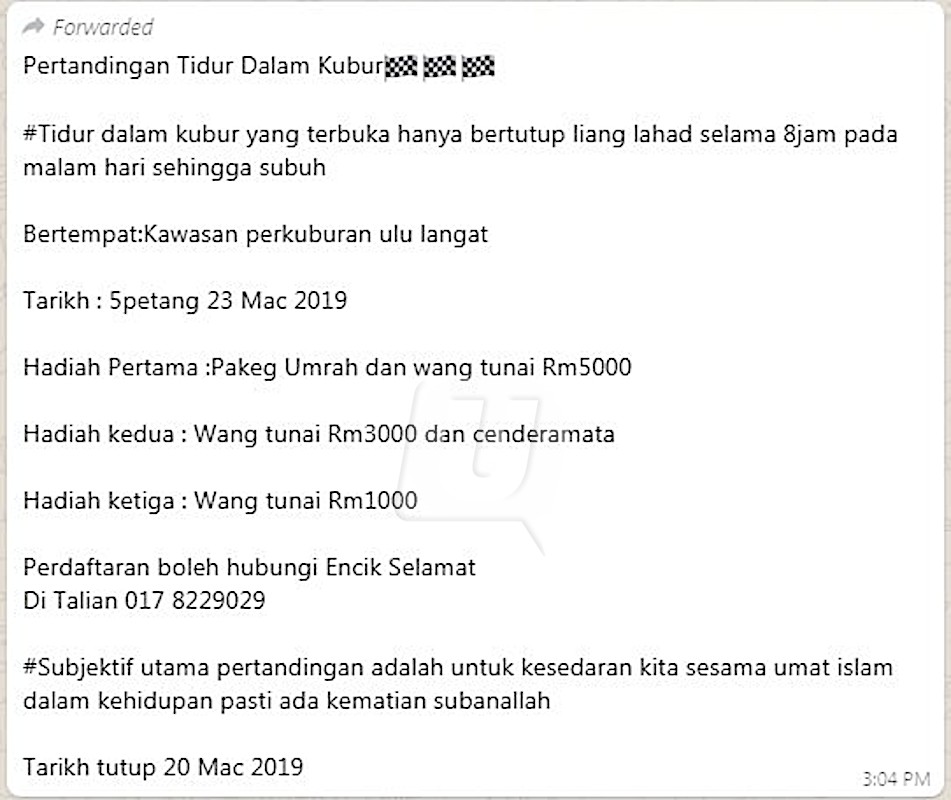 KUALA LUMPUR 6 Mac – “Saya tidak tahu langsung tentang benda ini. Ada orang yang viral dan letak nombor telefon,” jelas seorang wanita yang menjadi mangsa selepas nombor telefon miliknya disalahguna sebagai pengendali Pertandingan Tidur Dalam Kubur. Melalui status yang dikongsikan di laman Facebook milik Julie Christine Martin, dia mendakwa menjadi mangsa individu perbuatan tidak bertanggungjawab dan merayu orang ramai menyebar mesej berkenaan dan tidak menghubunginya mengenai hal itu. “Saya…