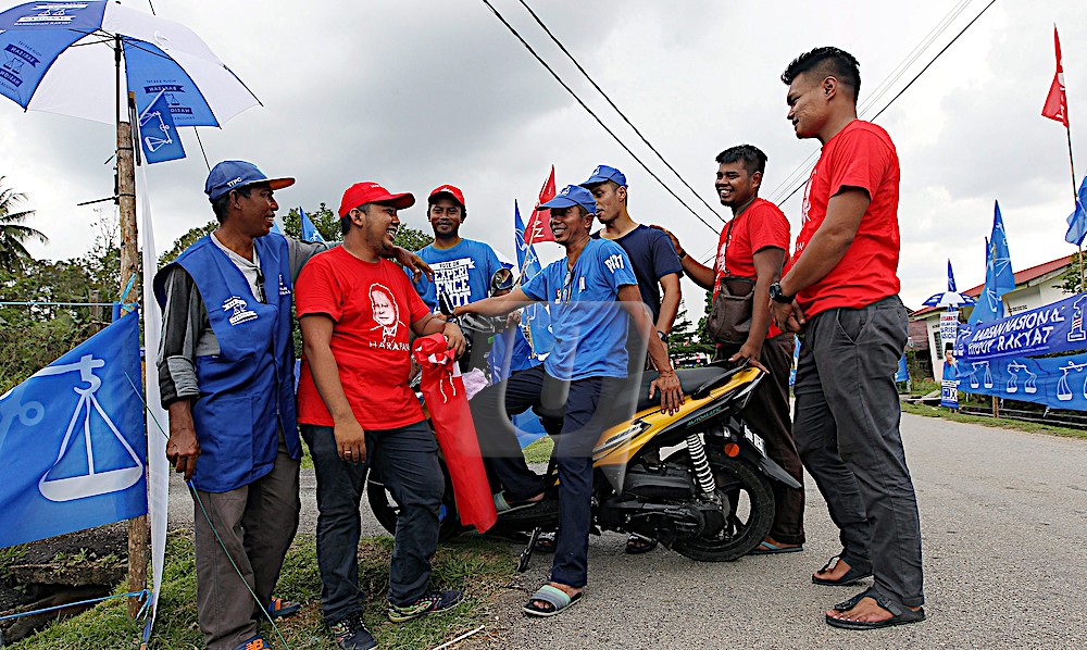 WALAUPUN berbeza fahaman politik, para penyokong dan petugas parti Pakatan Harapan (PH) dan Barisan Nasional (BN) tidak mempunyai masalah untuk berbual dan bertanya khabar antara satu sama lain. Di Kampung Bemban, Mambau di Rembau, jurugambar Utusan Malaysia sempat merakam gambar petugas kedua-dua parti yang sibuk dalam kempen Pilihan Raya Kecil (PRK) Dewan Undangan Negeri (DUN) Rantau beramah mesra selepas selesai memasang bendera dan bahan kempen masing-masing. – UTUSAN ONLINE