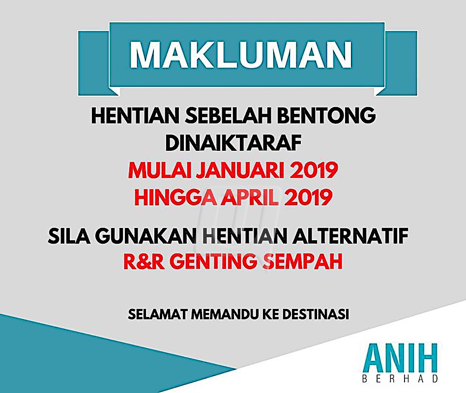 KUALA LUMPUR 24 April – Hentian Rehat dan Rawat (R&R) Bentong arah Barat yang ditutup pada Mac hingga April ini akan dilanjutkan sehingga Mei depan bagi kerja-kerja naik taraf yang masih dijalankan. Lebuhraya Pantai Timur dalam satu kenyataan memaklumkan, kerja-kerja penambahbaikan masih dijalankan di kawasan hentian berkenaan sehingga diberitahu apabila siap sepenuhnya nanti. “Oleh itu, pengguna dinasihatkan untuk menggunakan Hentian R&R Genting Sempah sebagai alternatif,” katanya. – UTUSAN ONLINE