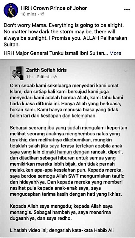 KUALA LUMPUR 1 Mei – Tunku Mahkota Johor, Tunku Ismail Sultan Ibrahim cuba menenangkan bondanya yang tertekan dan gusar kerana ada pihak yang mencerca, memerli dan menjadikan anakanda-anakandanya sebagai bahan hiburan pada waktu ini. TANGKAP layar Facebook Tunku Ismail Sultan Ibrahim yang cuba menenangkan bondanya yang berasa gusar hari ini. – UTUSAN ONLINE Tunku Ismail memberitahu, bondanya juga tidak perlu gusar dengan perkara yang terjadi sejak kebelakangan ini termasuk membabitkan…