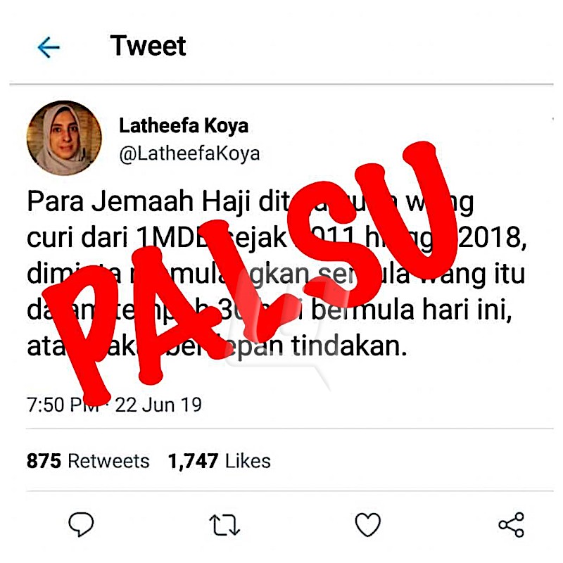 PUTRAJAYA – Suruhanjaya Pencegahan Rasuah Malaysia (SPRM) membuat laporan polis berhubung satu ciapan palsu menerusi Twitter membabitkan nama Ketua Pesuruhjaya itu, Latheefa Koya. Menurut kenyataan SPRM, laporan dibuat di Ibu Pejabat Polis Daerah (IPD) Putrajaya kelmarin. “Ia berhubung ciapan para jemaah haji ditaja menggunakan dana 1Malaysia Development Berhad (1MDB) menerusi Twitter bawah nama Ketua Pesuruhjaya SPRM, Latheefa Koya, kami ingin menegaskan bahawa ciapan tersebut adalah palsu. “Ia ditular oleh pihak…