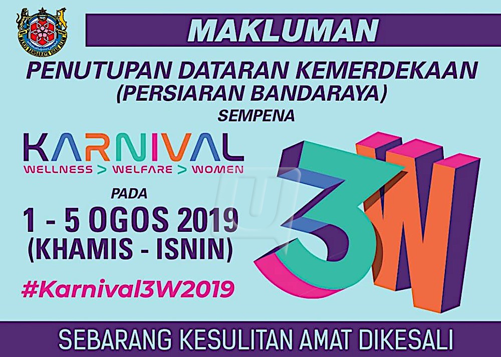 KUALA LUMPUR 2 Ogos – Majlis Bandaraya Shah Alam (MBSA) menutup sementara Daratan Kemerdekaan (Persiaran Bandaraya) pada 1 hingga 5 Ogos ini sempena Karnival 3W ( Wellness, Welfare, Women). MBSA dalam satu kenyataan memberitahu, penutupan itu dilakukan bagi memberi laluan kepada pelbagai aktiviti yang telah disediakan antaranya pertunjukan fesyen kanak-kanak, sembang santai, forum, eco free market dan sebagainya. “Orang ramai dijemput hadir bagi memeriahkan program tersebut. Kami memohon maaf atas…