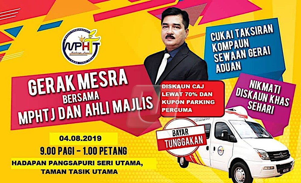 KUALA LUMPUR 2 Ogos – Orang ramai berpeluang menikmati diskaun caj lewat bayaran cukai taksiran serta kompaun sebanyak 70 peratus melalui program Gerak Mesra bersama Majlis Perbandaran Hang Tuah Jaya (MPHTJ) dan Ahli Majlis. MPHTJ dalam satu kenyataan memberitahu, program tersebut akan diadakan di Hadapan Pangsapuri Seri Utama, Taman Tasik Utama pada Ahad ini. “Mereka yang ingin membuat pembayaran boleh datang ke lokasi program pada pukul 9 pagi hingga 1…