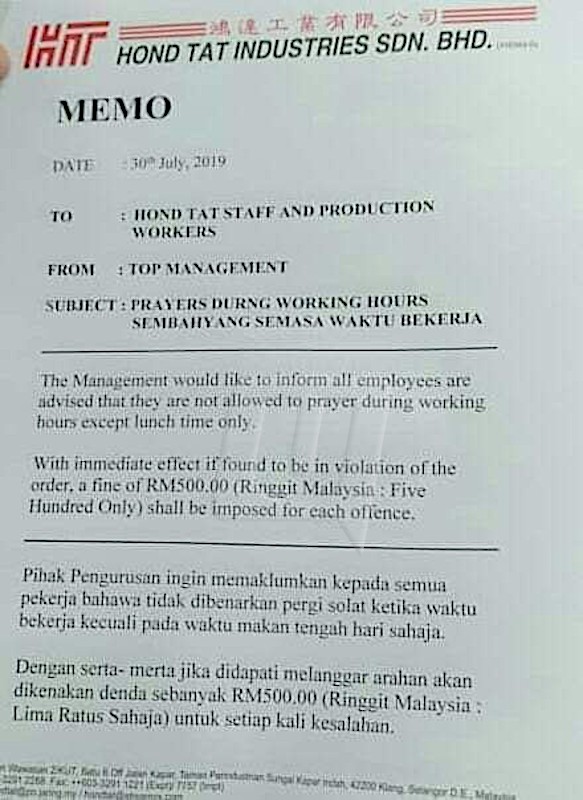 KLANG 1 Ogos – Pekerja sebuah kilang plastik di Taman Perindustrian Sungai Kapar mengesahkan bahawa memo larangan dan denda RM500 jika solat adalah benar. Pengesahan itu sekaligus bertentangan dengan penafian yang dibuat pengurusan syarikat terbabit kepada Ahli Dewan Undangan Negeri (ADUN) Meru, Mohd. Fakhrulrazi Mohd. Mokhtar. Bagaimanapun, jelas pekerja yang enggan namanya didedahkan itu, selepas memo tersebut diedarkan dan menjadi isu, pihak pengurusan syarikat telah menukar waktu rehat bagi menyelesaikan…