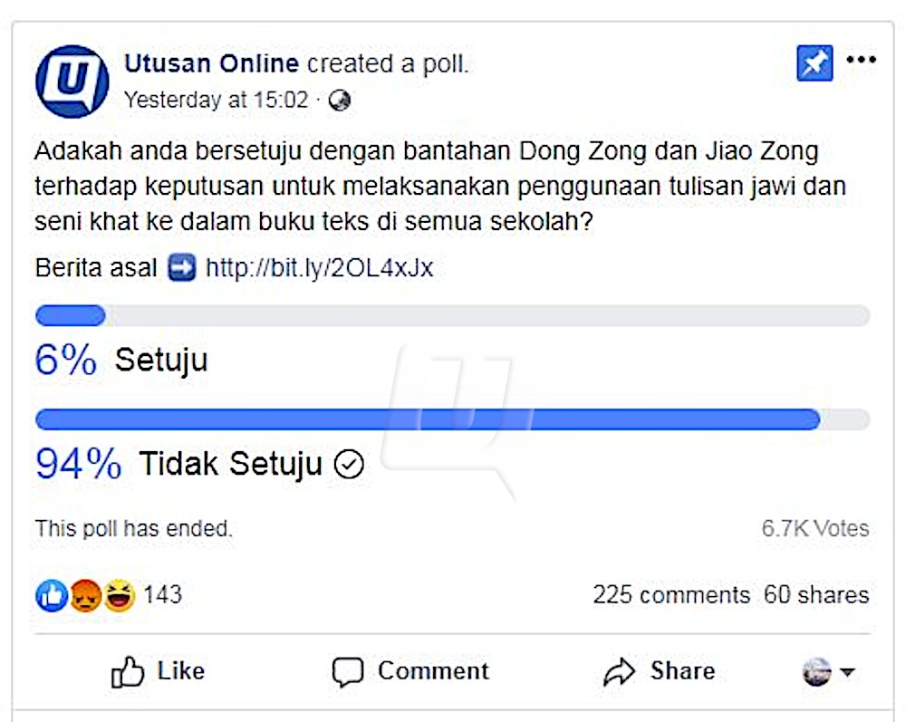 KUALA LUMPUR 2 Ogos – Lebih 6,200 warga maya menentang bantahan dua pertubuhan Cina, Gabungan Jawatankuasa Sekolah Cina (Dong Zong) dan Gabungan Persatuan Guru-guru Sekolah Cina Malaysia (Jiao Zong) yang menolak pengenalan tulisan khat dan jawi dalam buku teks sekolah. Jumlah itu dikumpul dalam tempoh 24 jam hasil undian Facebook dijalankan oleh Utusan Online bermula semalam. Undian itu berakhir hari ini menunjukkan 6,200 warga maya itu menguasai 94 peratus jumlah…
