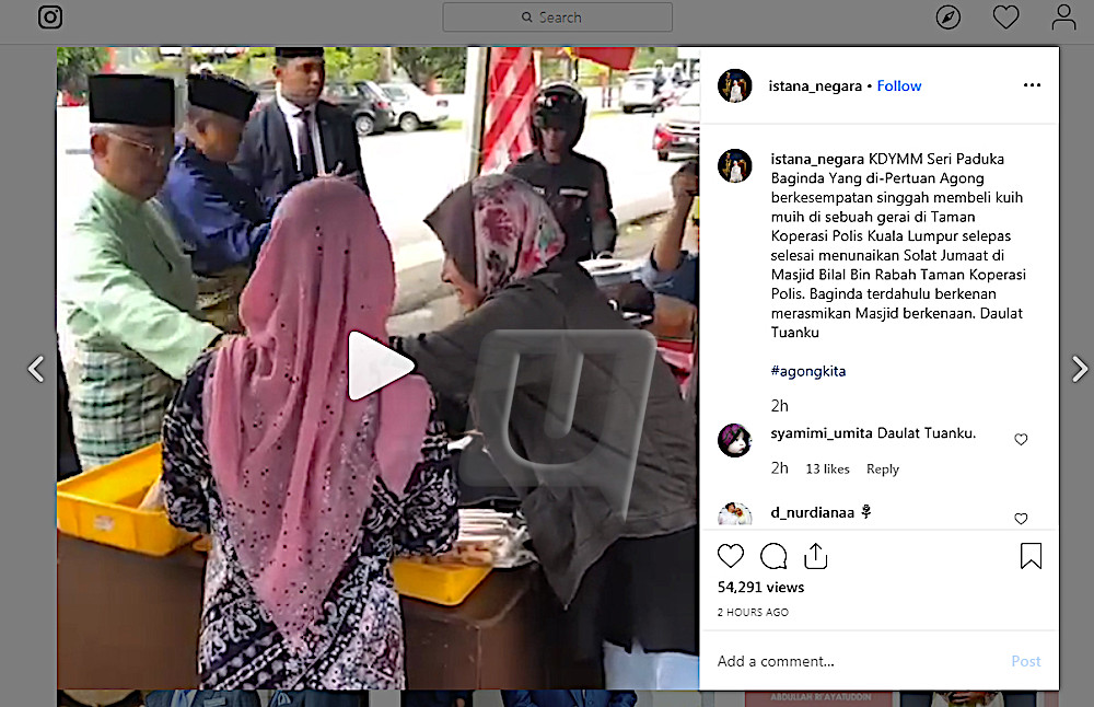 KUALA LUMPUR 4 Okt. – Yang di-Pertuan Agong, Al-Sultan Abdullah Ri’ayatuddin Al-Mustafa Billah Shah berkenan mencemar duli membeli kuih muih di sebuah gerai di Taman Koperasi Polis di sini hari ini. Istana Negara menerusi hantaran dalam akaun Instagram rasminya memberitahu, baginda berbuat demikian selepas selesai menunaikan solat Jumaat di Masjid Bilal Bin Rabah Taman Koperasi polis hari ini. Terdahulu, baginda merasmikan masjid berkenaan. – UTUSAN ONLINE