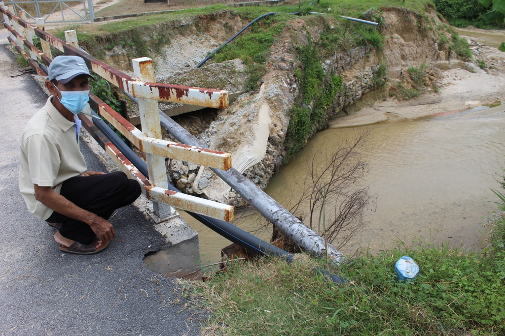 “Binaan batu sangkar yang jatuh menyebabkan aliran air deras menghentam struktur jambatan di bahagian bertentangan. Ikutkan di bawah jambatan ini sudah semakin kosong dari hari ke hari.