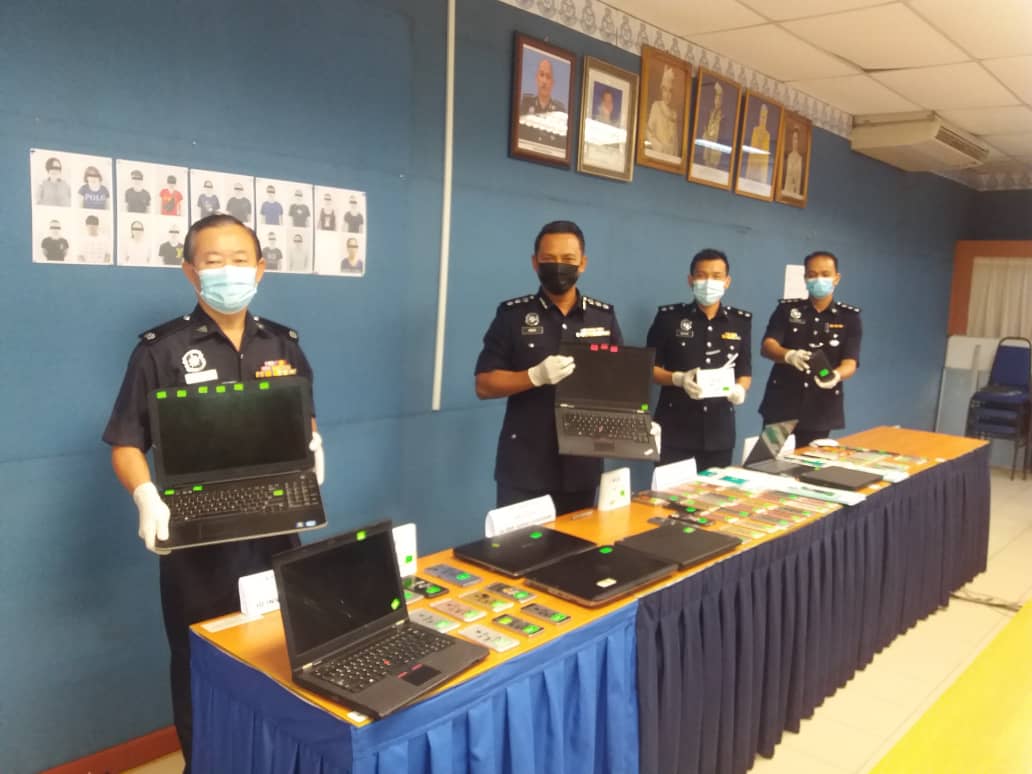 Ketua Polis Daerah Manjung, Asisten Komisioner Nor Omar Sappi berkata, polis merampas 57 unit telefon bimbit dan lapan komputer riba yang digunakan dalam penipuan itu yang menyasarkan pengguna Facebook.