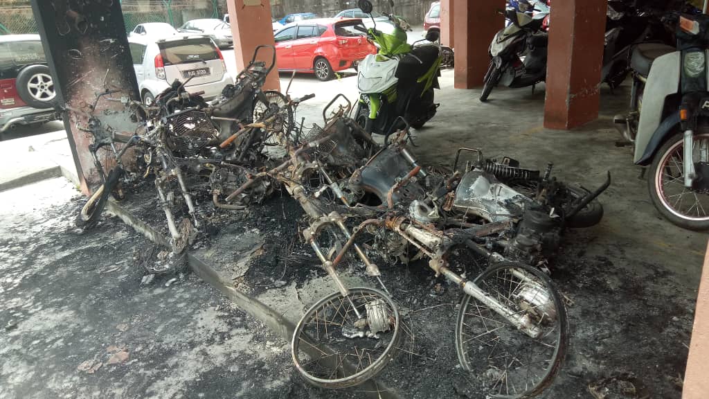Dalam kejadian kira-kira pukul 3.26 pagi itu, tujuh buah motosikal musnah manakala selebihnya terbakar pada sebahagian kecil kenderaan tersebut.