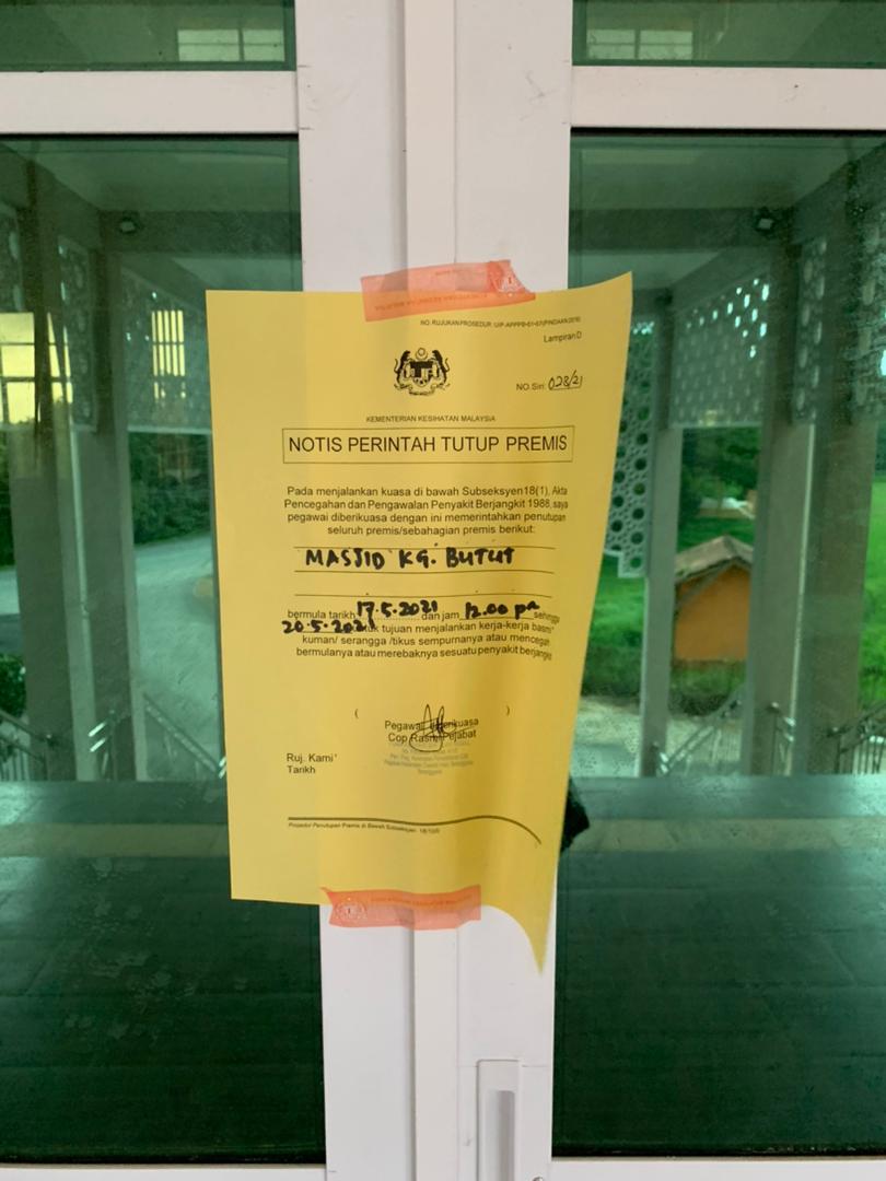 HULU TERENGGANU: Masjid Kampung Butut di daerah ini diarahkan tutup hari ini berikutan dua jemaahnya yang merupakan pasangan suami isteri disahkan positif Covid-19.