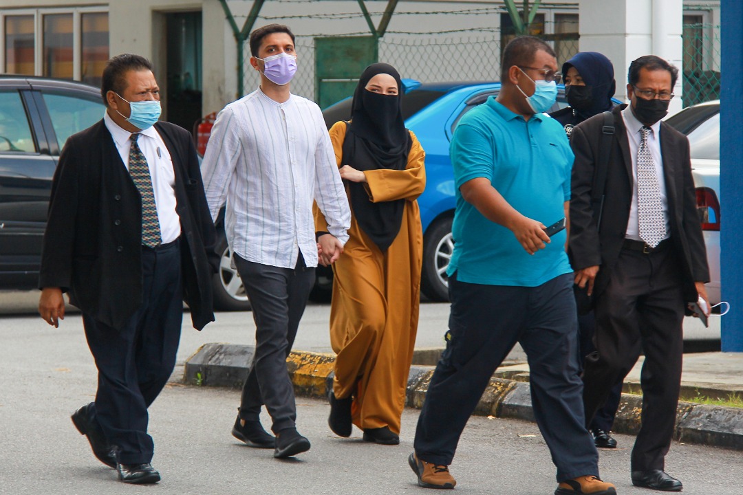 Noor Neelofa yang berpakaian baju berwarna kuning tiba di pekarangan Ibu pejabat Polis Daerah (IPD) Seremban di Seremban 2, di sini pada pukul 10.15 pagi dengan menaiki kereta BMW dan ditemani suaminya, Muhammad Haris Mohd. Ismail.