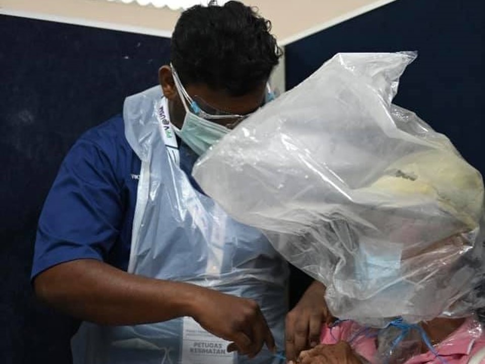 PETALING JAYA: Seorang lelaki yang hadir bagi mendapatkan suntikan di Pusat Pemberian Vaksin (PPV) Universiti Sains Malaysia (USM) semalam menarik perhatian petugas apabila memastikan dirinya ‘dilindungi’ dengan menutup keseluruhan bahagian kepalanya dengan plastik.