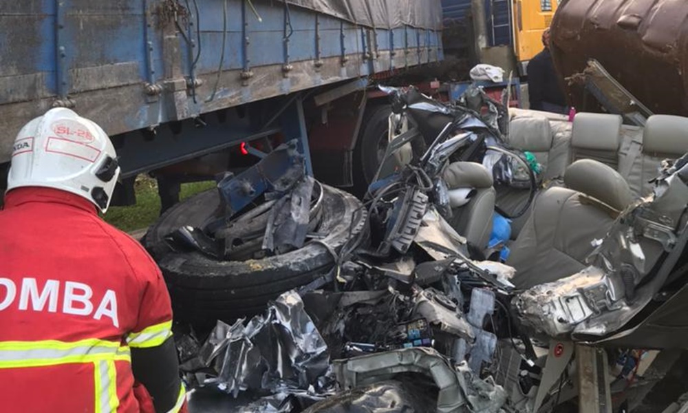 SABAK BERNAM: Seorang lelaki maut tersepit apabila kereta jenis Toyota Vios yang dipandunya terperosok di bawah lori treler yang membawa muatan kelapa sawit dalam kejadian pada pukul 5 pagi tadi.