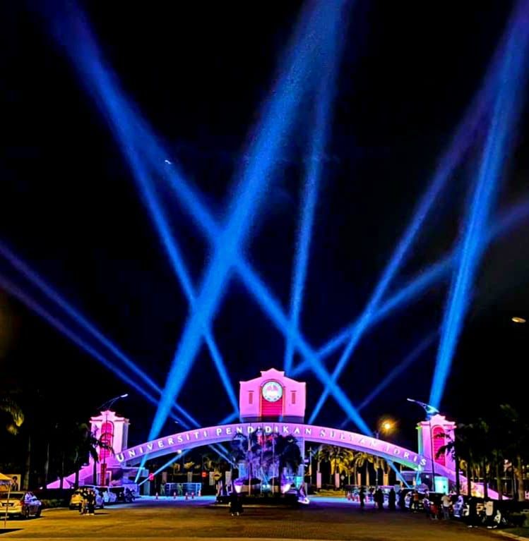 “UPSI memasang dan memainkan lampu neon pelbagai warna di hadapan pintu gerbang sempena Istiadat Konvokesyen yang sedang berlangsung dari 20 hingga 26 November ini sehingga malam sambutan 100 tahun UPSI pada 29 November ini.